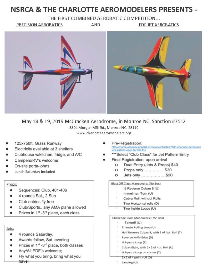 NSRCA & The Charlotte Aeromodelers Presents by Greg Carter | Apr 7, 2019 | Aerobatics, Events Their First Combined Aerobatic Competition Winners. Snyder, Hoke, Pritchett, Craft, and Hannah Check out the flyers during the event. Use this link to see additional CAM Pattern Event photos. Contact Us Link