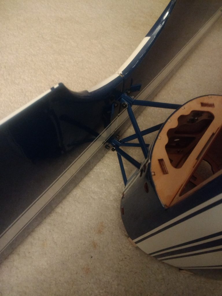 Slide the fuselage between the wings assembled and attach the front, rear, and cross aluminum wing struts.