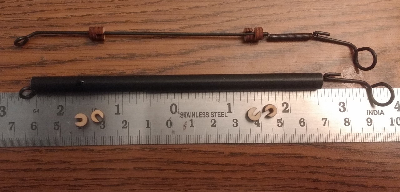 Since I chose to use for the cross struts the aluminum tubes that were supplied for the landing gear suspension assembly, I used a same size carbon fiber tube for the landing gear suspension assembly. CA glue the little wood guides to the wire. The spring can just hook the wire ring when you insert assembled long wire in the other end.